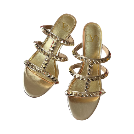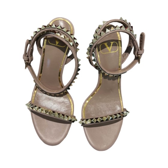 【VALENTINO】2024最新ROCKSTUD铆钉饰三带后空凉鞋| 6.0cm细高跟 小牛皮鞋面+金字塔柳钉装饰