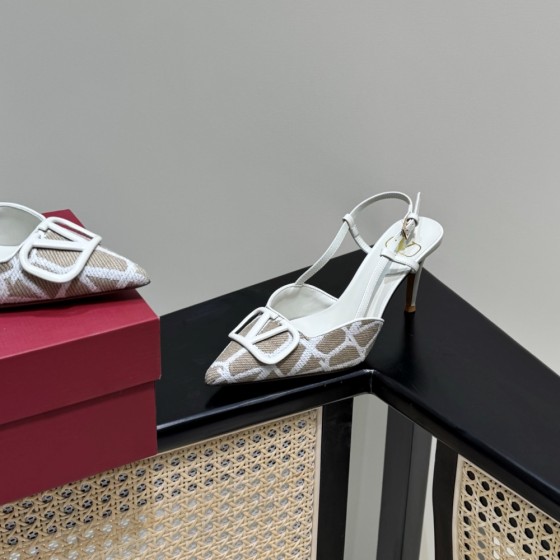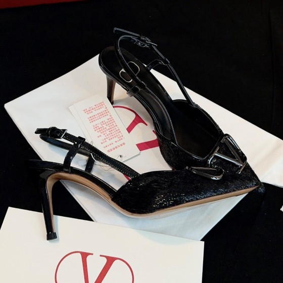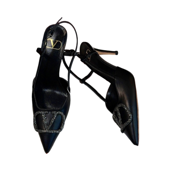 【VALENTINO】羊猄皮烫钻尖头后空细高跟凉鞋| 钻扣鞋面| 高光进口羊皮内里| 意大利真皮大底