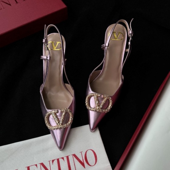 【VALENTINO】Metallic silk Swarovski rhinestone V-buckle sandals | 8.0cm stiletto heel