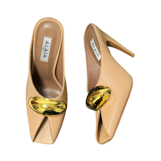 【ALAIA】Metallic Buckle Mules | 4.1-Inch Heel | Breathable Lambskin & Durable Grip