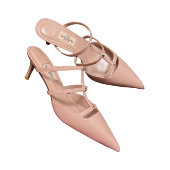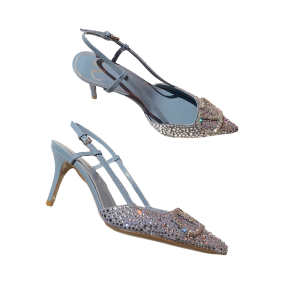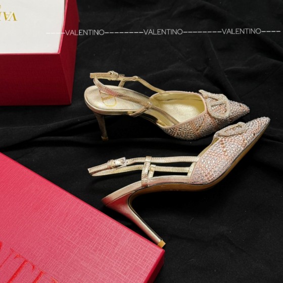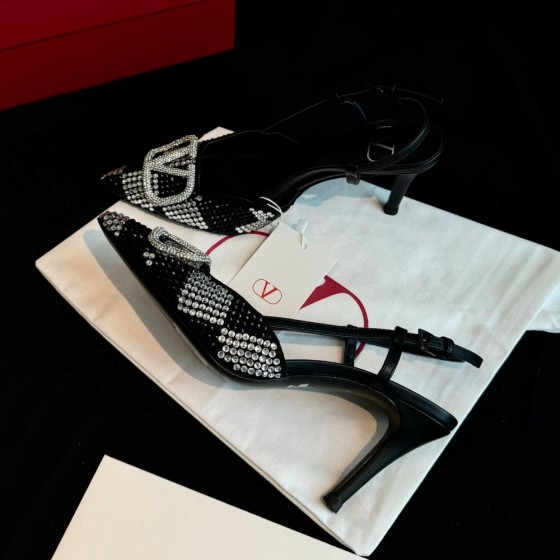 【VALENTINO】羊猄皮烫钻尖头后空细高跟凉鞋| 钻扣鞋面| 高光进口羊皮内里| 意大利真皮大底