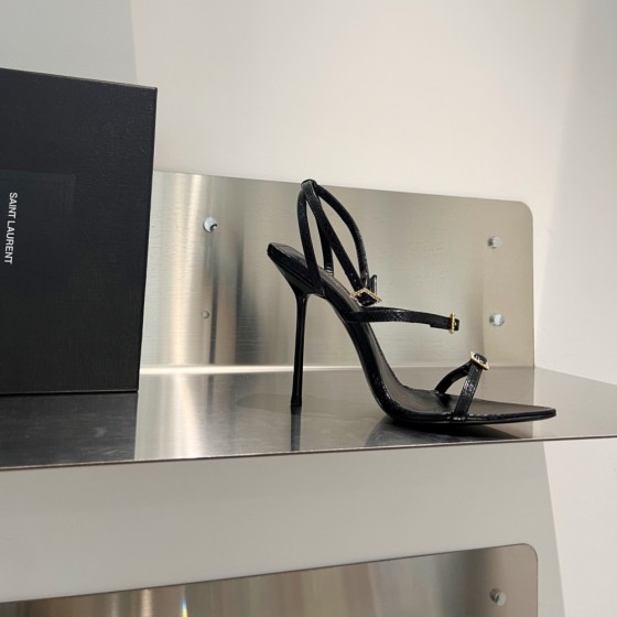 【Saint.Laurent】2023 Strappy Sandals 10cm - Python Leather & Crystal Buckle|3/4 Strap Design, Lambskin Lining